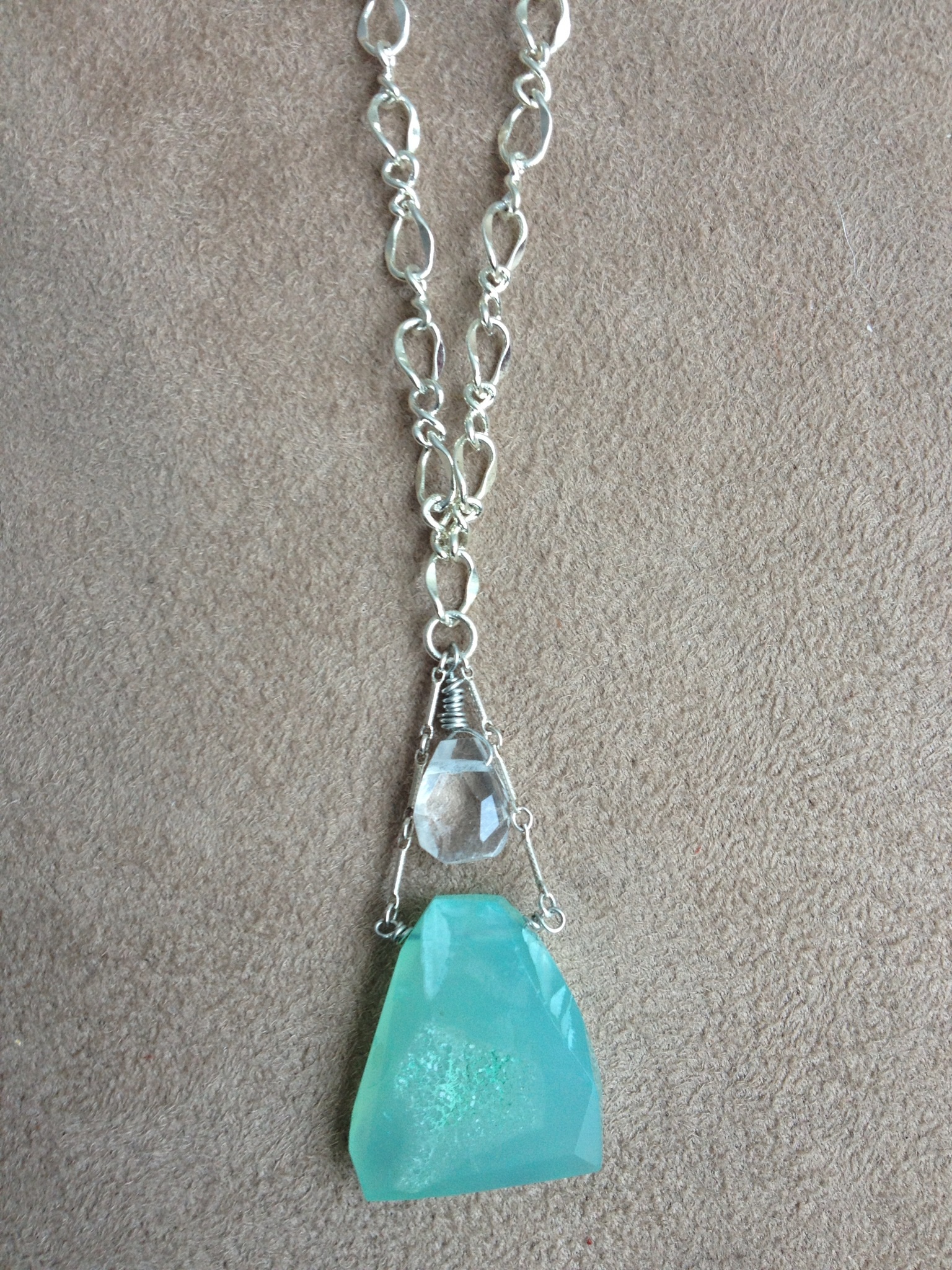 The Nikia Chalcedony pendant with silk-knotted labradorite stones $150