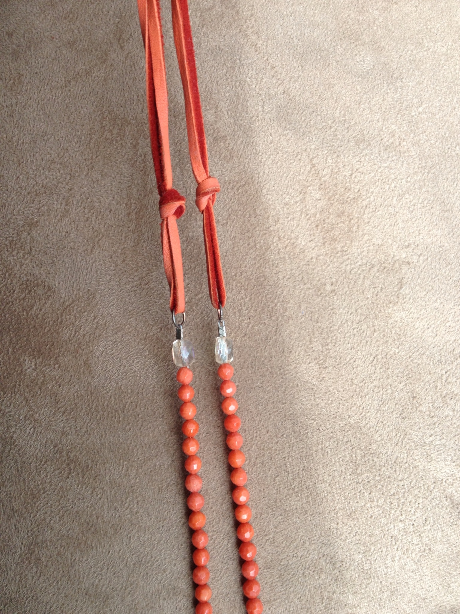 This necklace is funky and cool with the mix of semi-precious stones and leather.  Charlie has a contemporary style and wears  it for work and play- long or doubled up. The Charlie  sun stones and leather   $75