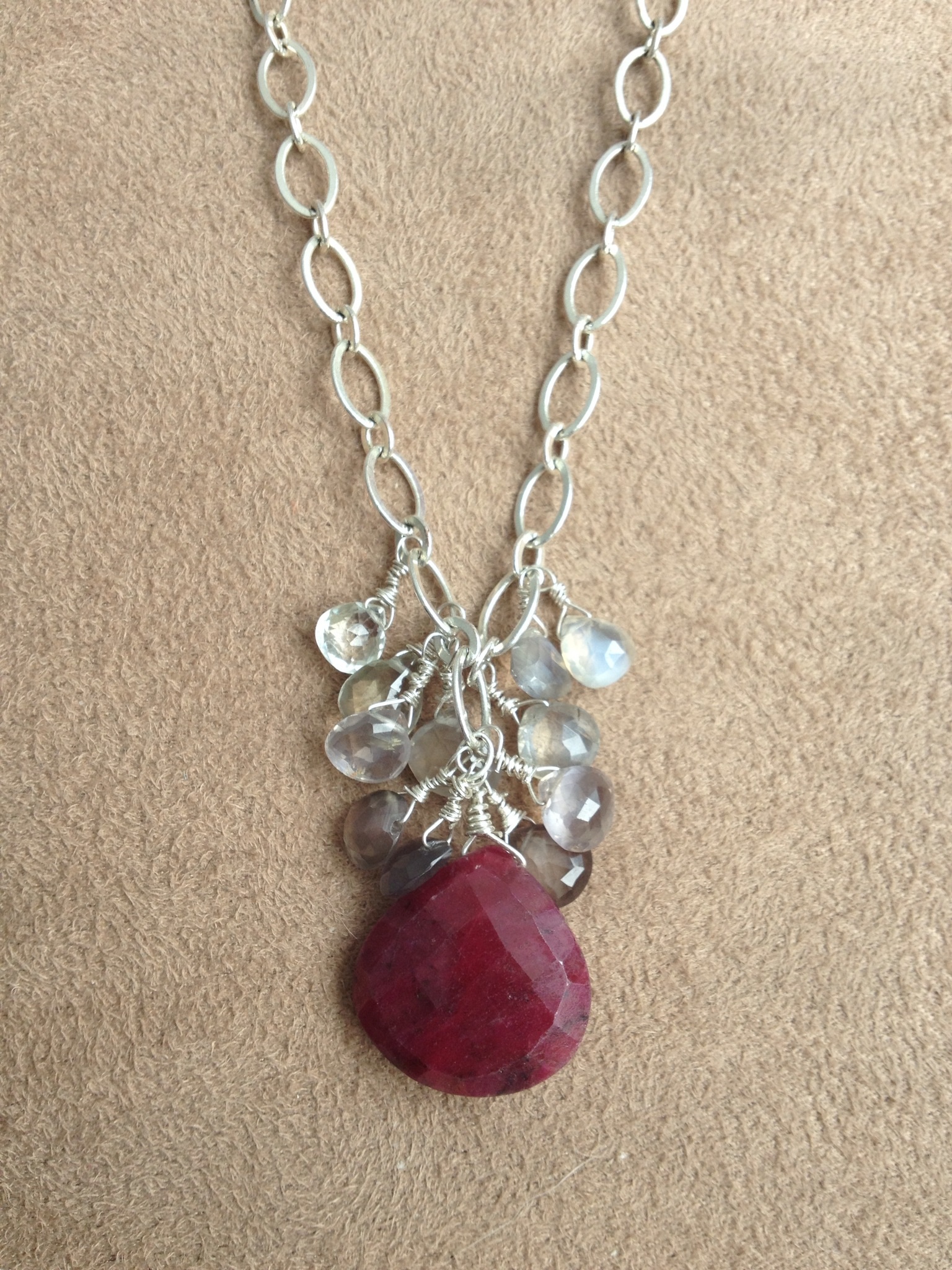 I have been thinking about a necklace  for my friend, Susana, for a long time because she primarily wears fine jewelry- this can be tricky. But I think this piece is just perfect for her.   My lovely friend wears a lot of gray and black BUT rocks dark red lipstick. The beautiful ruby gives a pop of color but also matches her fiery and passionate nature. I love the iolites that cascade like water around the  main stone.  Overall, a lovely, tranquil, elegant piece like Susana. image